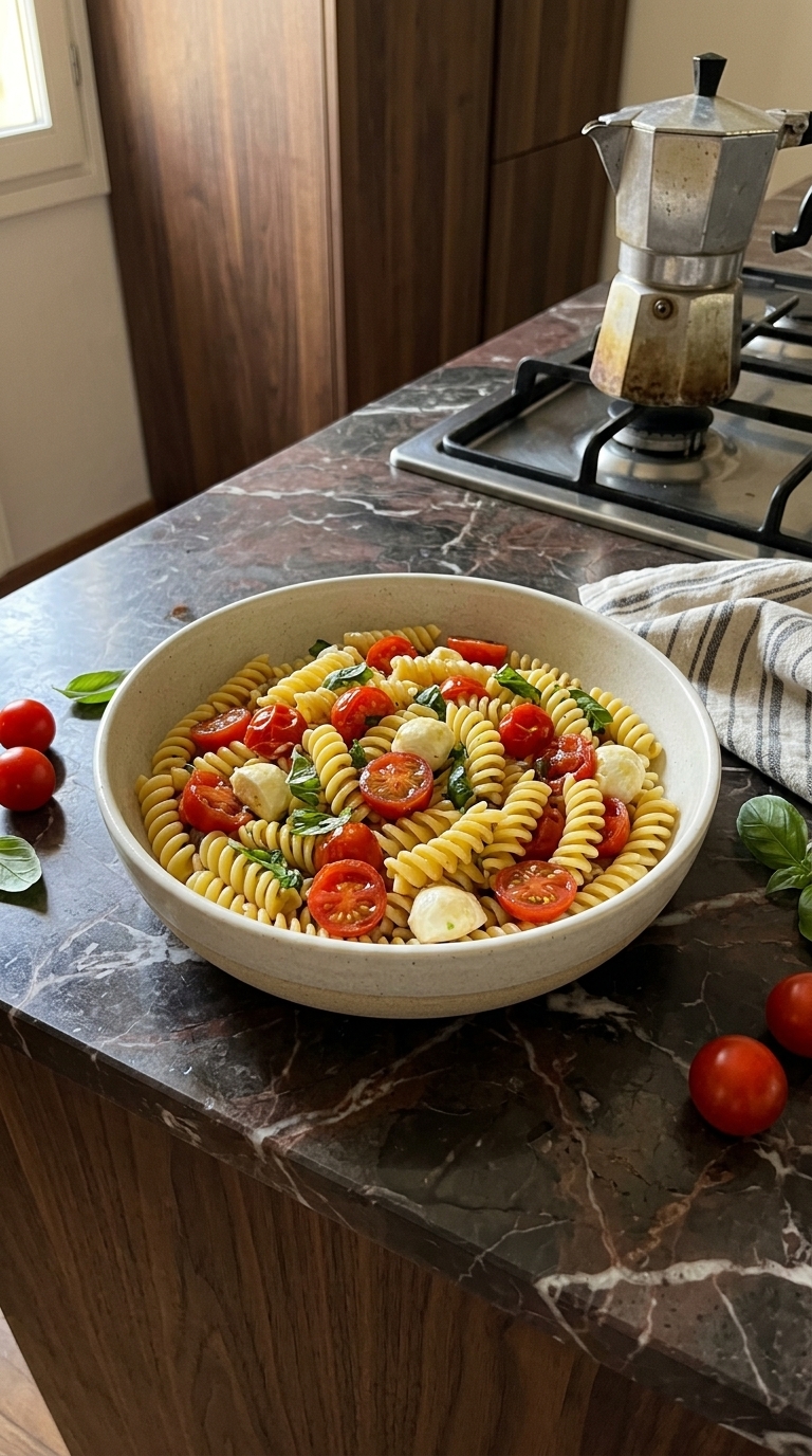 Con Leone sul fianco: pasta fredda di farro, tonno, pomodorini e basilico. Fine. Cioè lo so che non è una ricetta, è più un assemblaggio. Però il far…