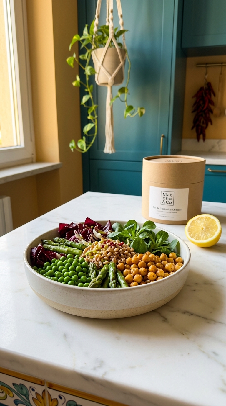 Piselli freschi sgranati a mano, feta sbriciolata, foglie di menta, un po' di rucola e cetriolo a fettine sottili. Condimento: olio evo, limone, sale.…
