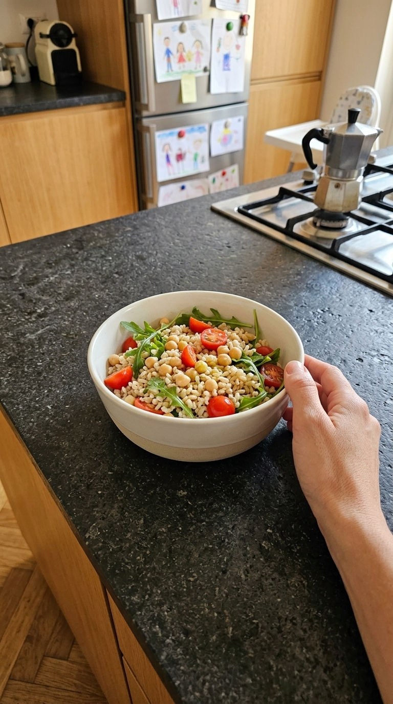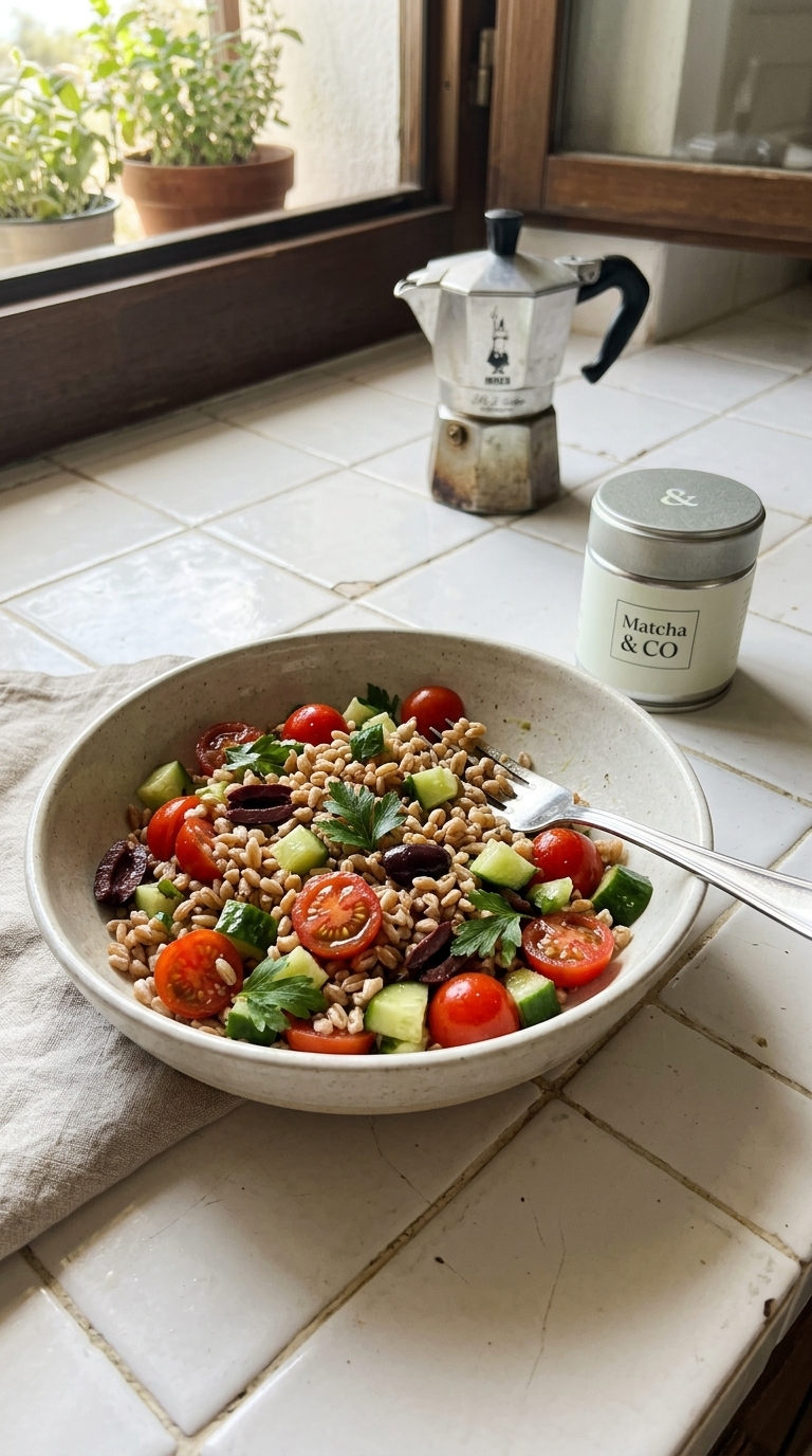 Farro freddo con pomodorini, cetriolo, olive nere e un filo di olio buono. Finisce lì. L'ho preparato ieri sera mentre aspettavo di uscire, tipo diec…