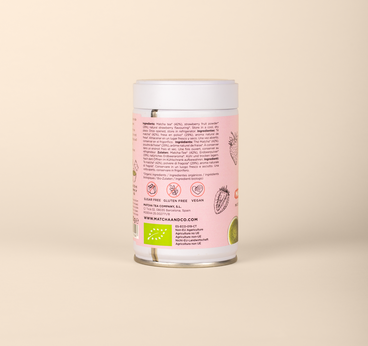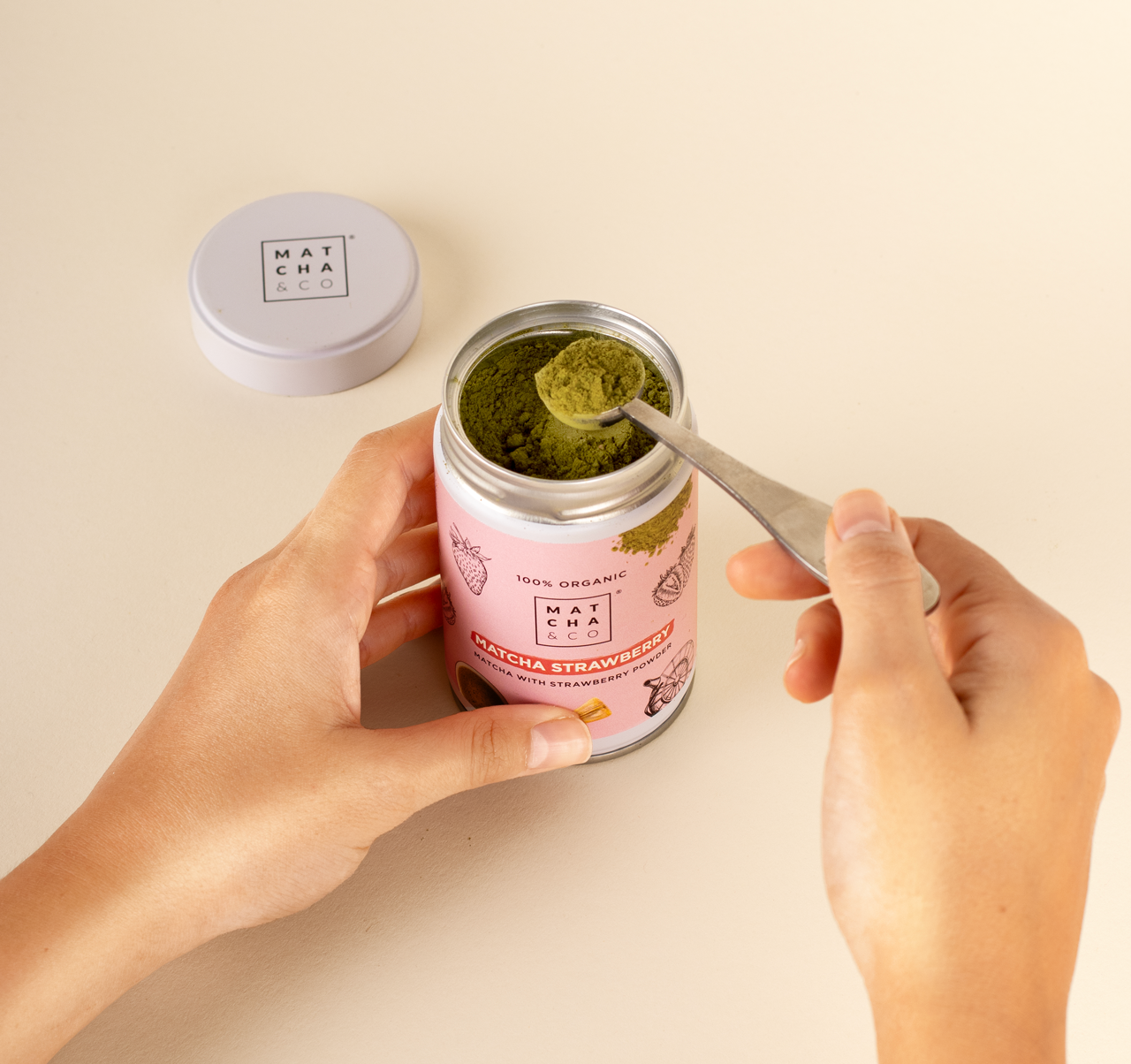 El té Matcha Fresa contiene 1/2 de la cafeína del matcha y es ideal para disfrutar en cualquier momento del día.